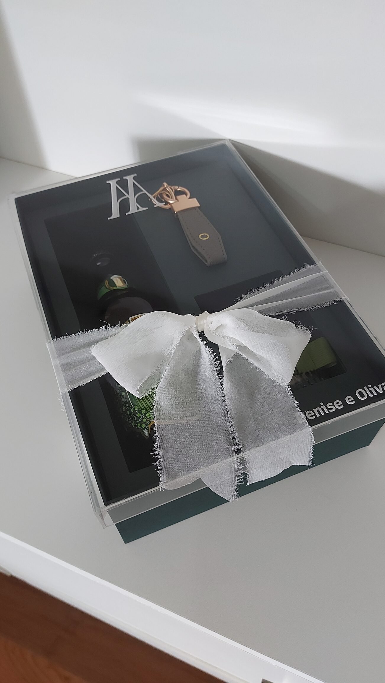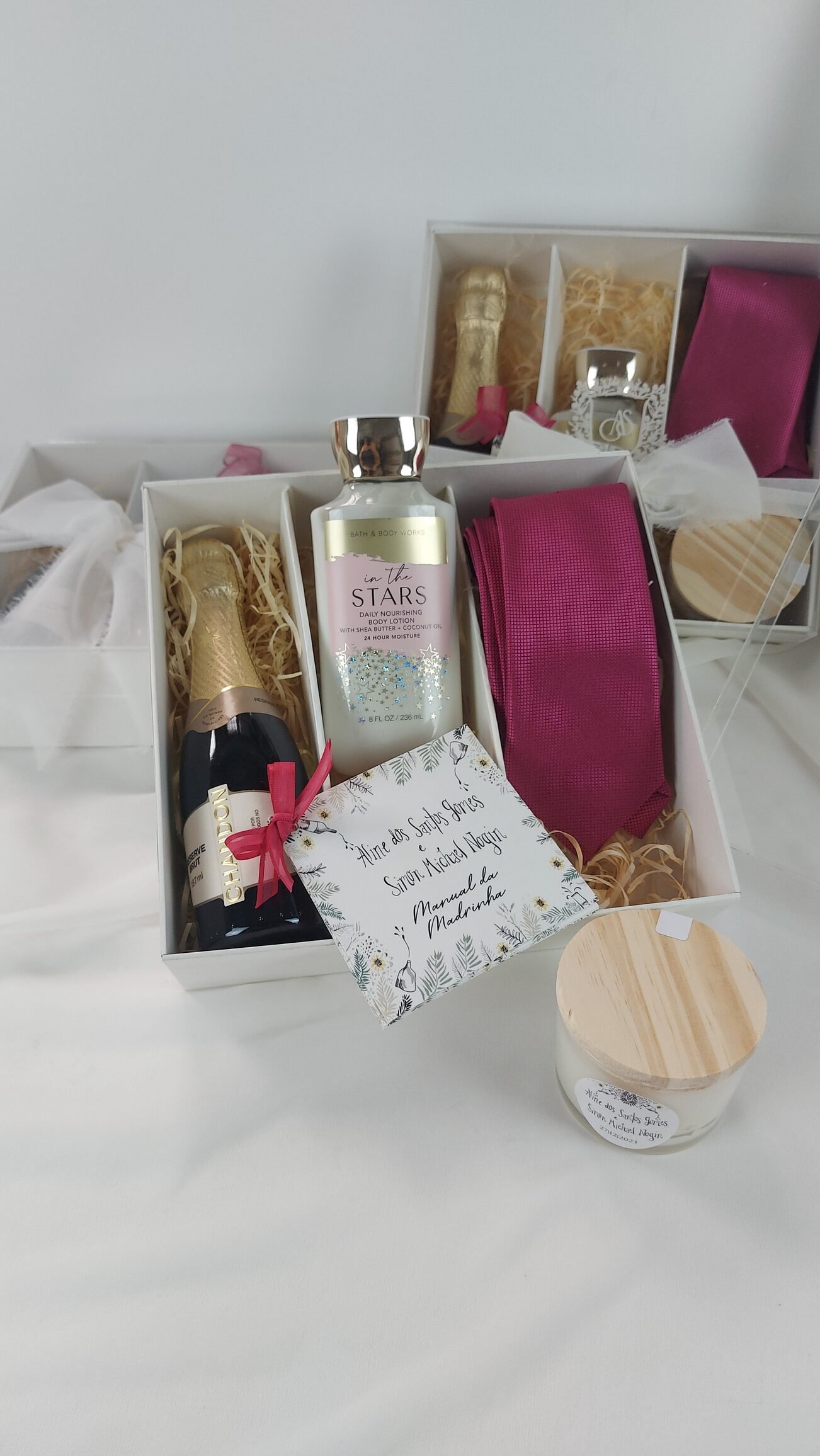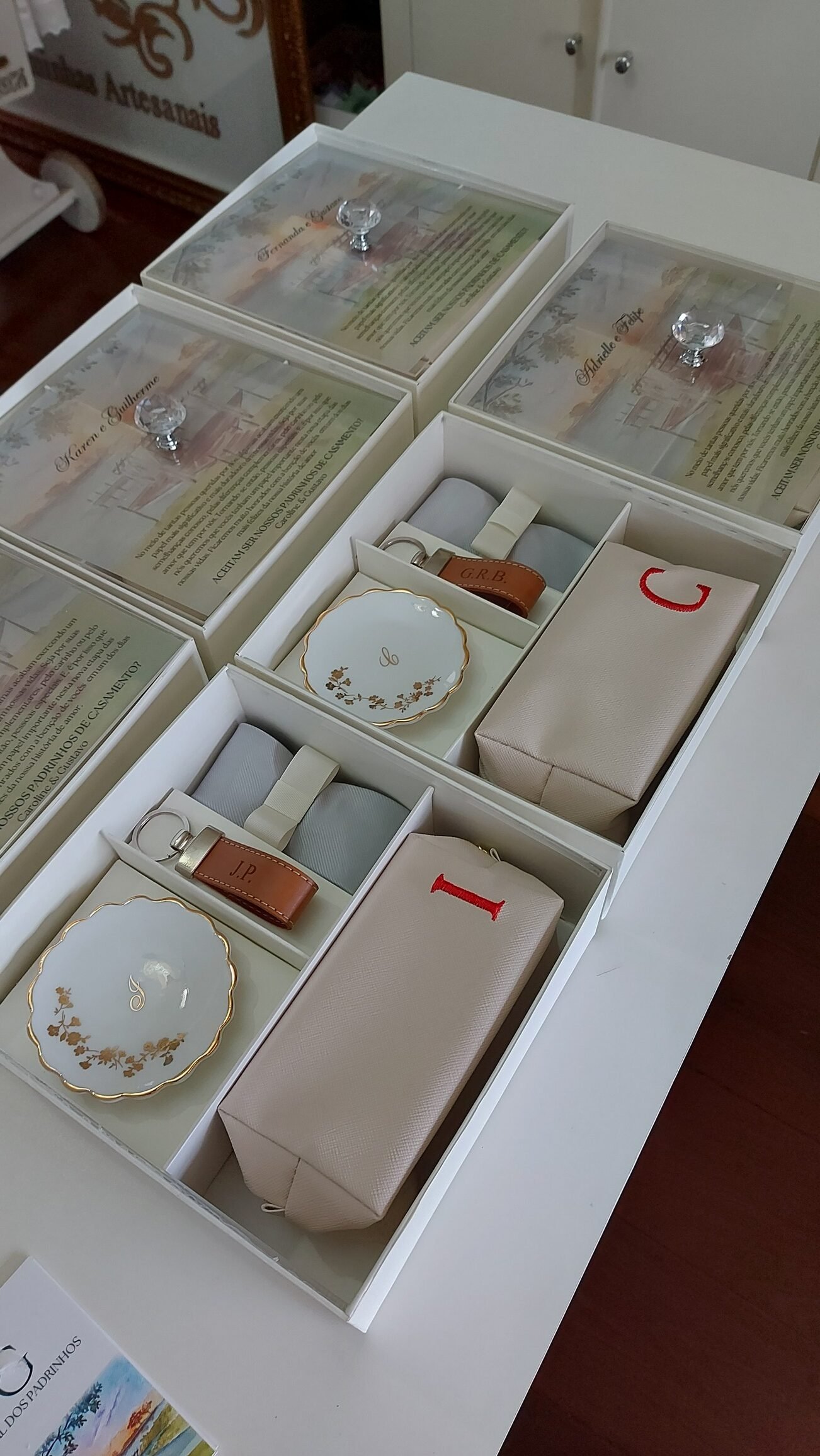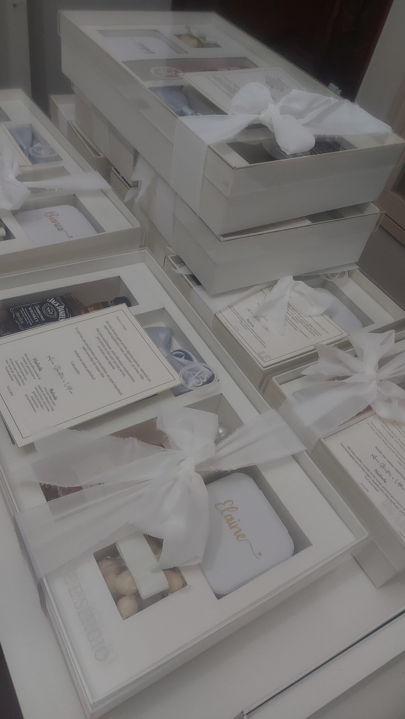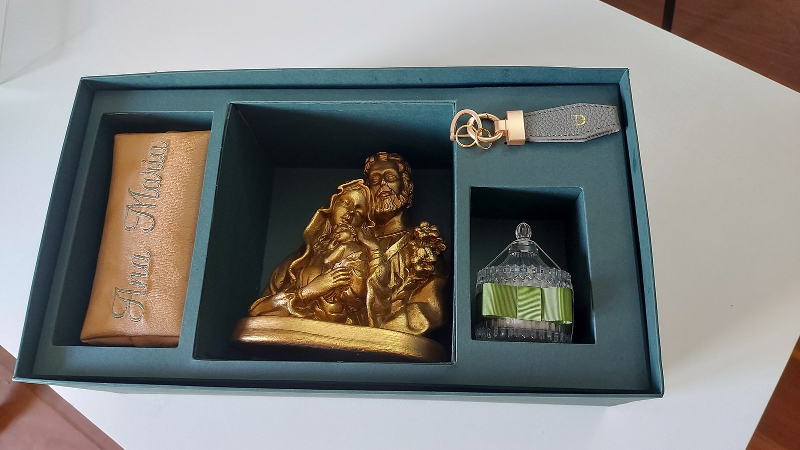 Itens cuidadosamente selecionados para a cerimônia – caixas, velas, lembranças – celebrando a fé com elegância, significado e carinho.