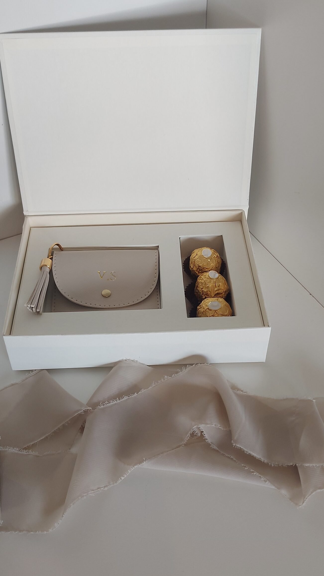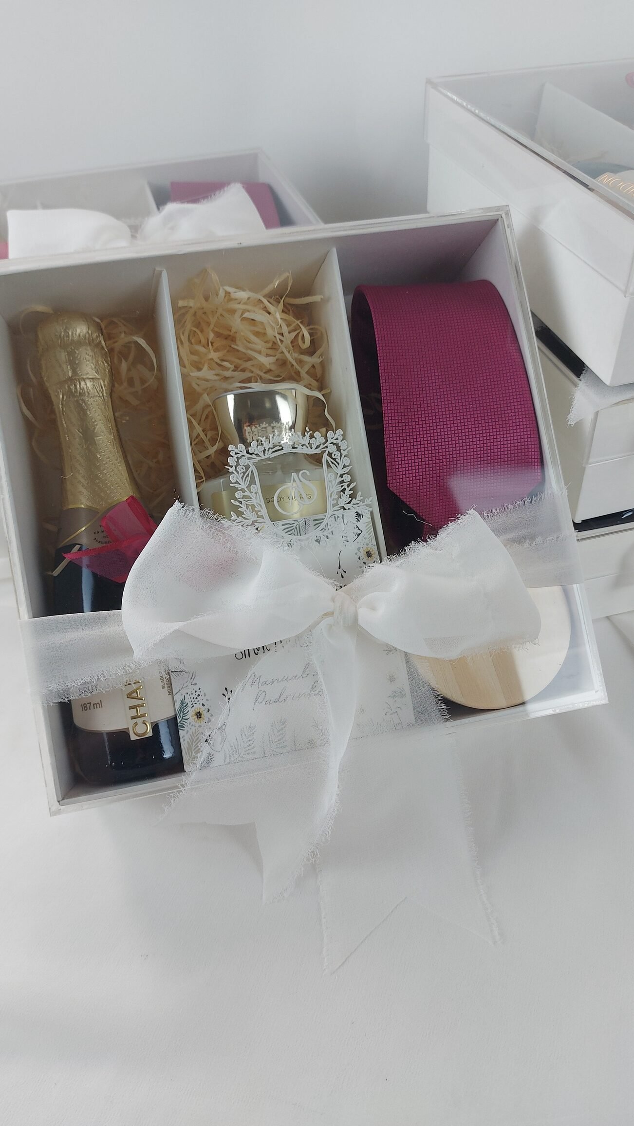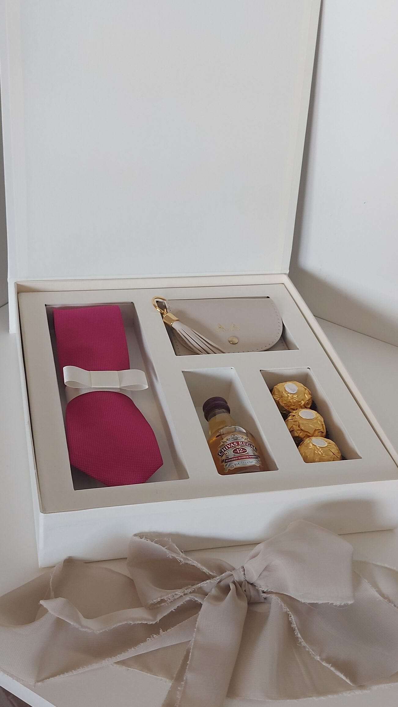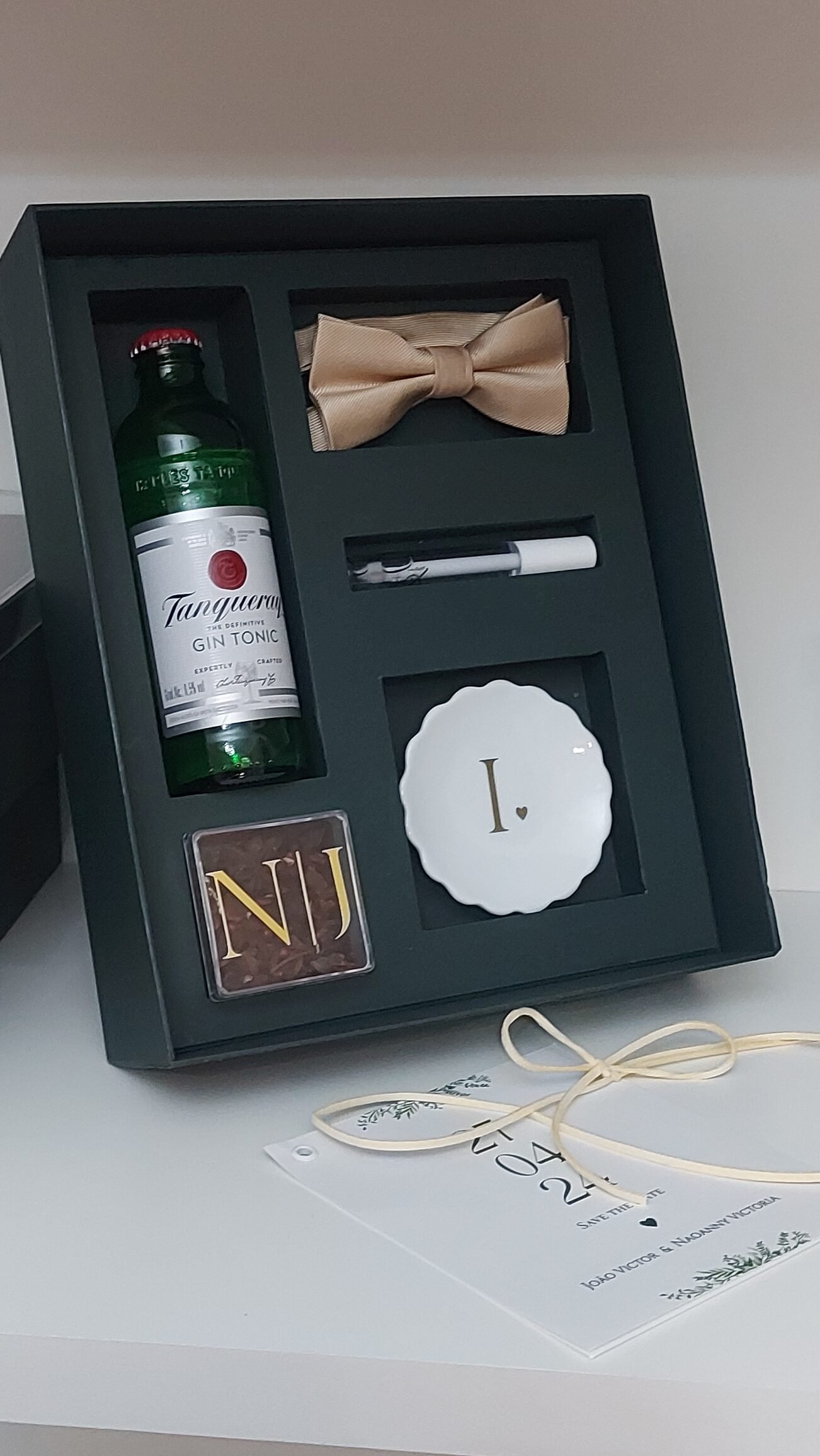 Itens cuidadosamente selecionados para a cerimônia – caixas, velas, lembranças – celebrando a fé com elegância, significado e carinho.