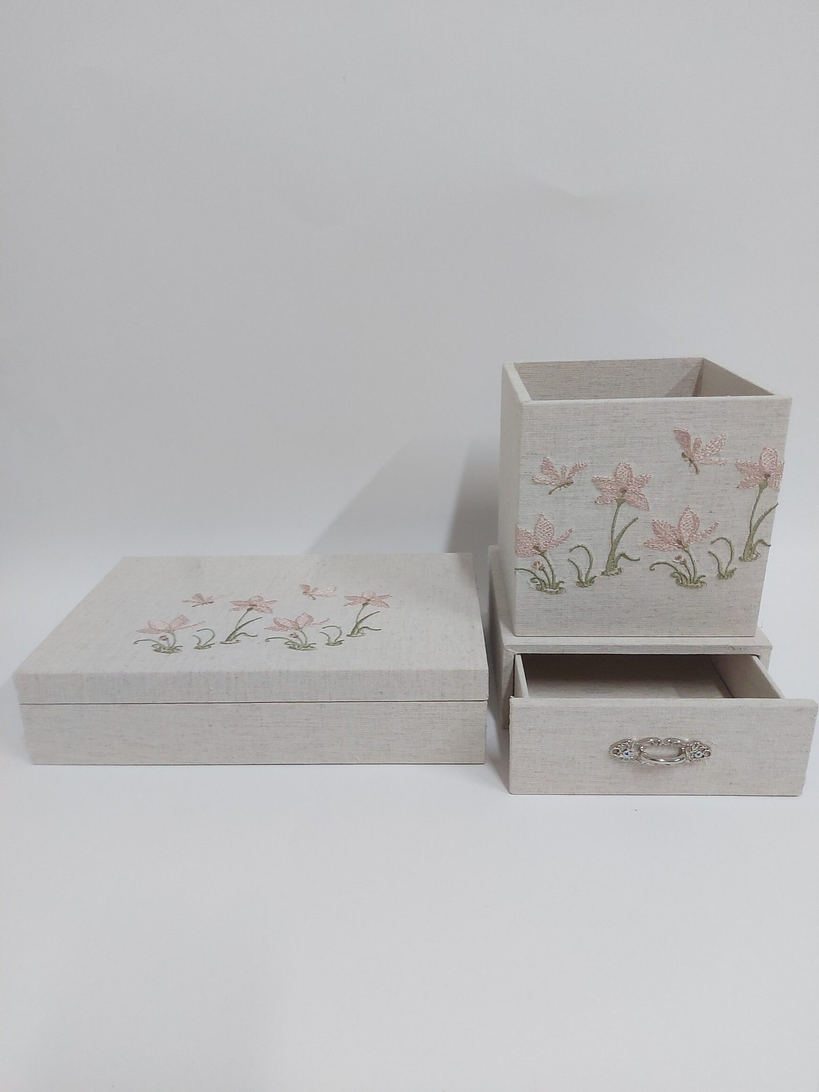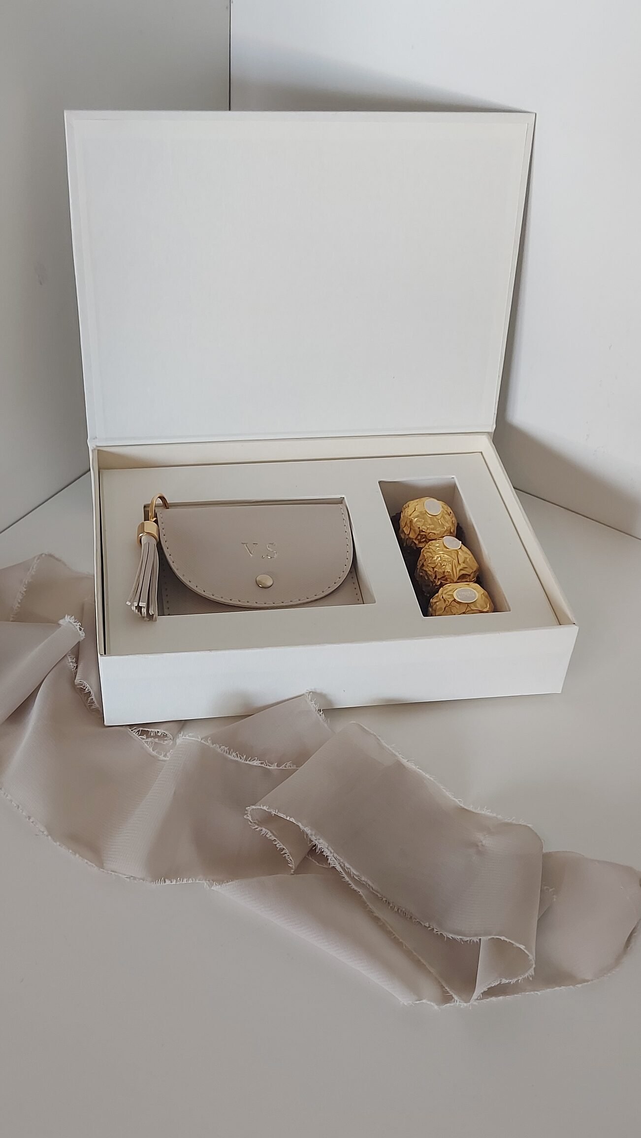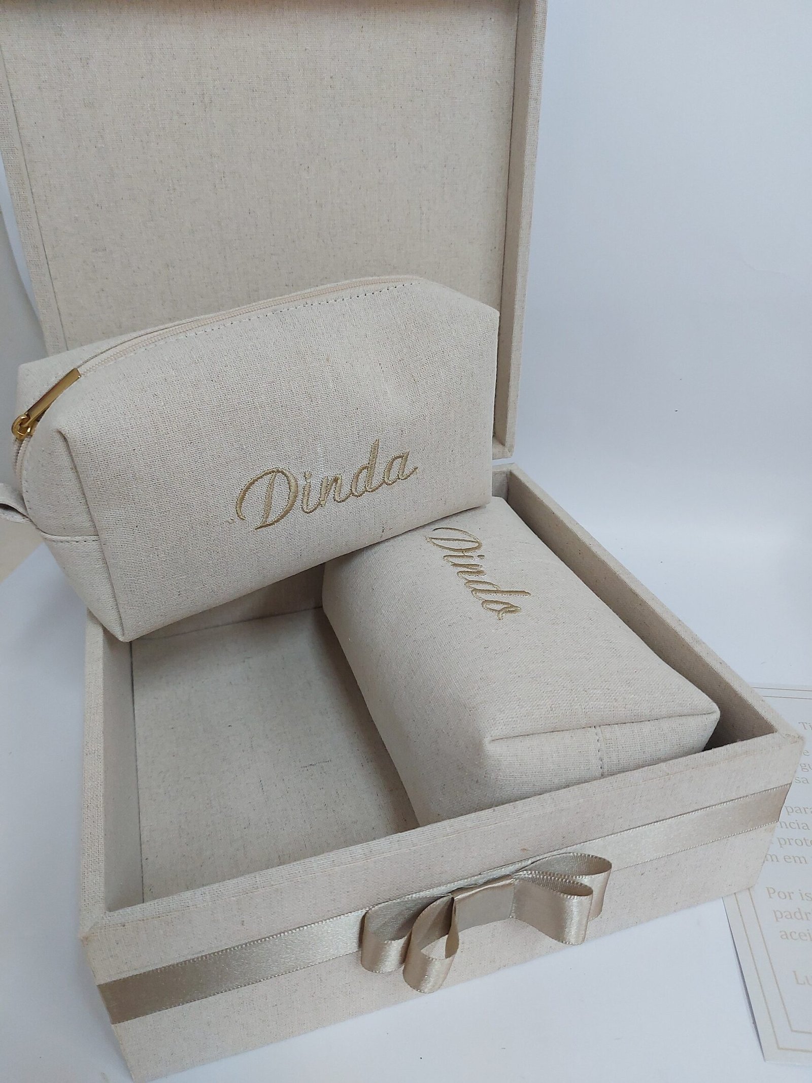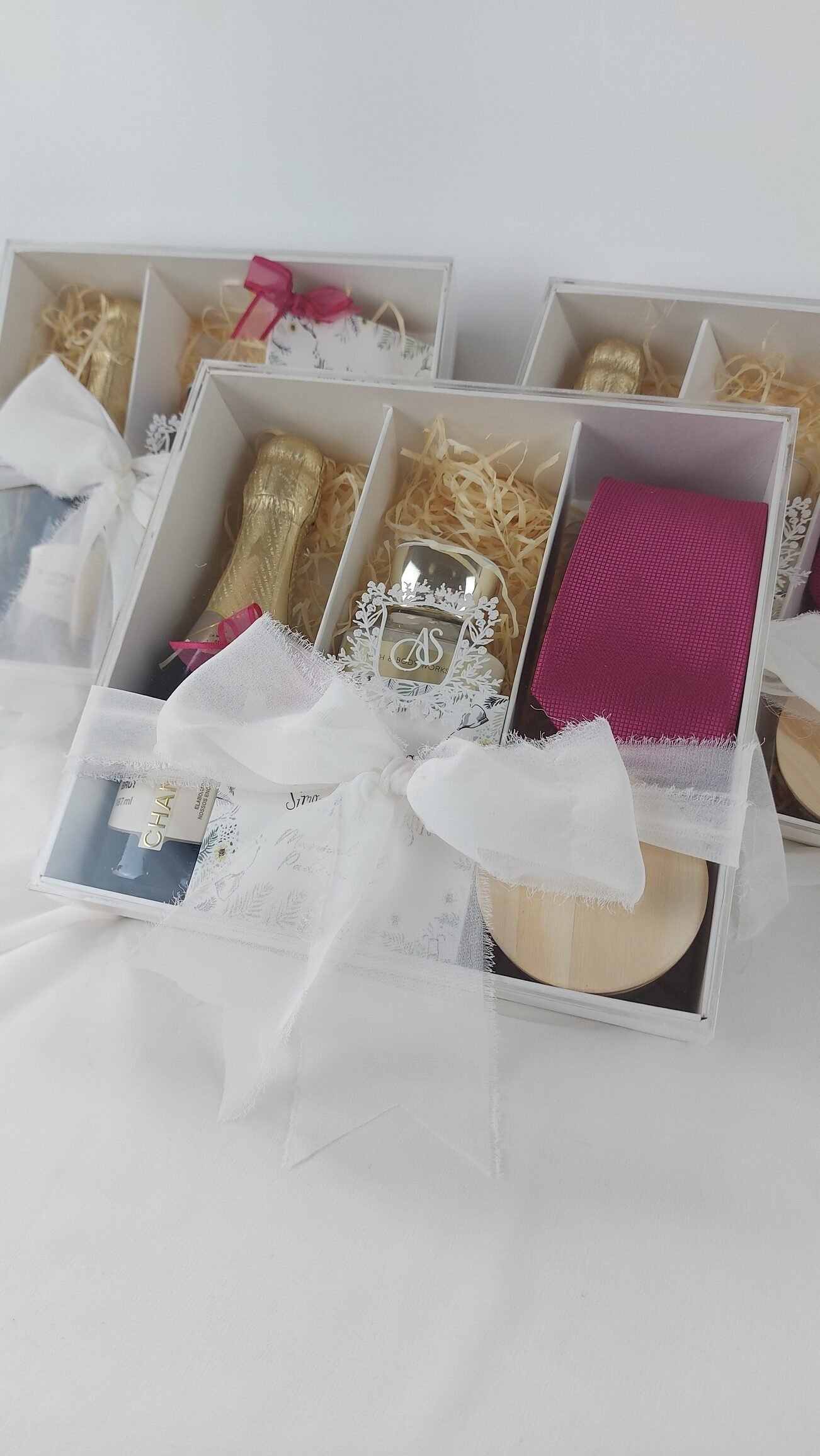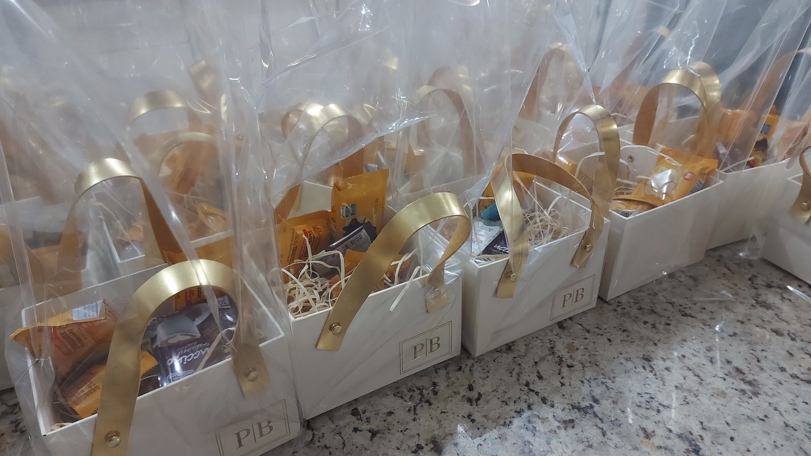 Itens cuidadosamente selecionados para a cerimônia – caixas, velas, lembranças – celebrando a fé com elegância, significado e carinho.